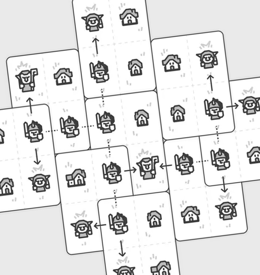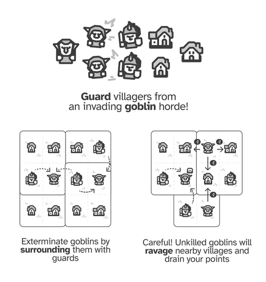 In Guards & Goblins, you’re trying to protect villagers from a goblin horde with the help of brave guards posted around the villages. As you lay cards on the table, try to position the guards strategically to prevent the goblins from ravaging the villages!