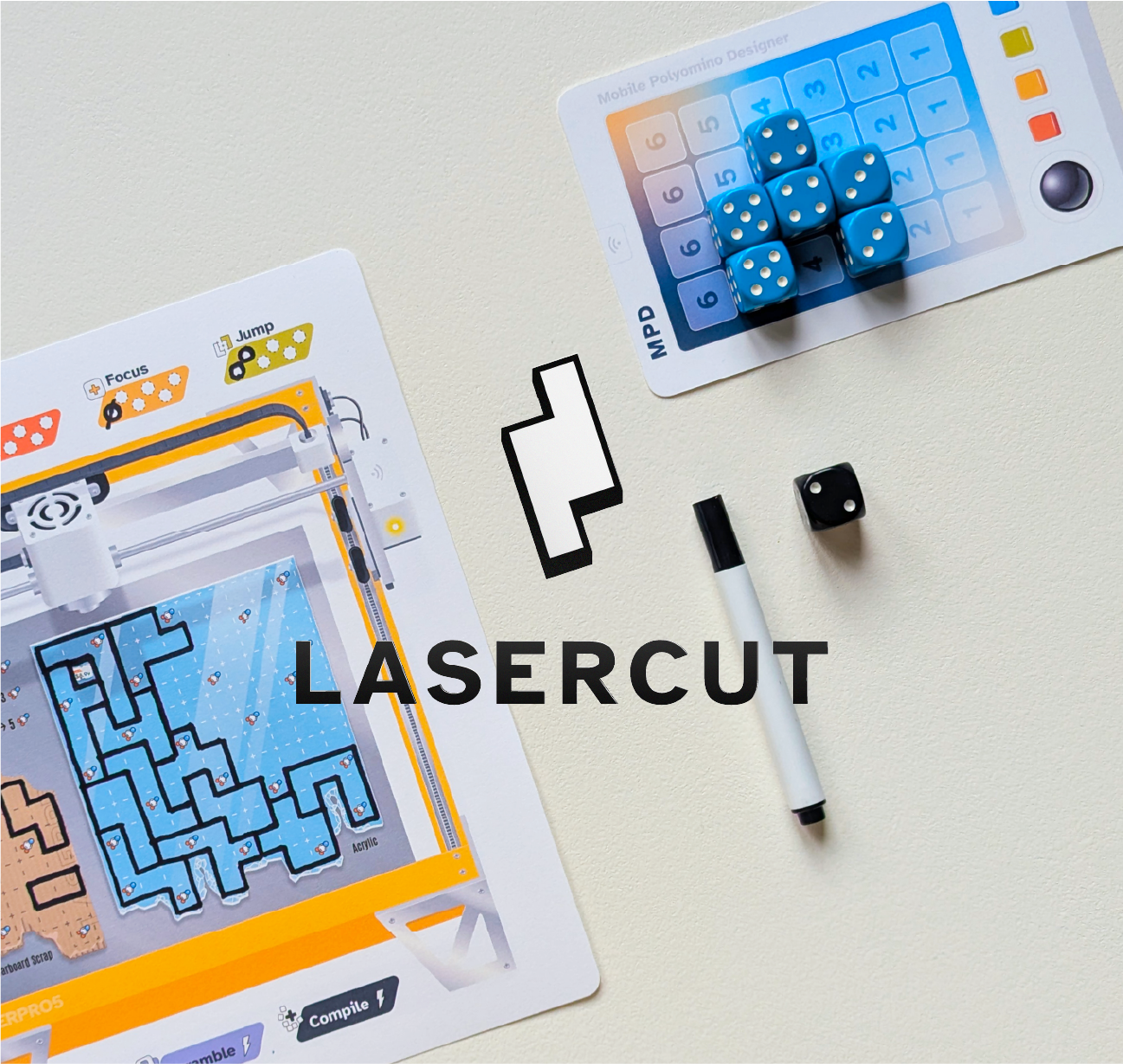 Printed Components: 1 Laser Cutter Sheet, 1 Hexomino Guide + MPD Sheet, 1 Challenges Sheet (Total: 3)