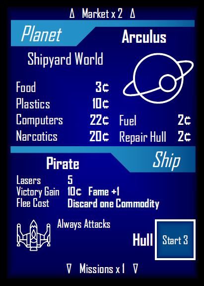 As the Captain of the shuttle Matilda, you will fly from planet to planet, trading goods, taking on missions, fighting off pirates and upgrading your ship. Perhaps you’ll dip into more unsavoury pursuits such as smuggling narcotics or even piracy, which can be highly lucrative but risky, bringing Bounty Hunters down on your head. What’s more, you’re competing against your nemesis The Renegade to gain Fame in the system, with a 5 Credit bet at stake. Well, the bet’s the important thing,