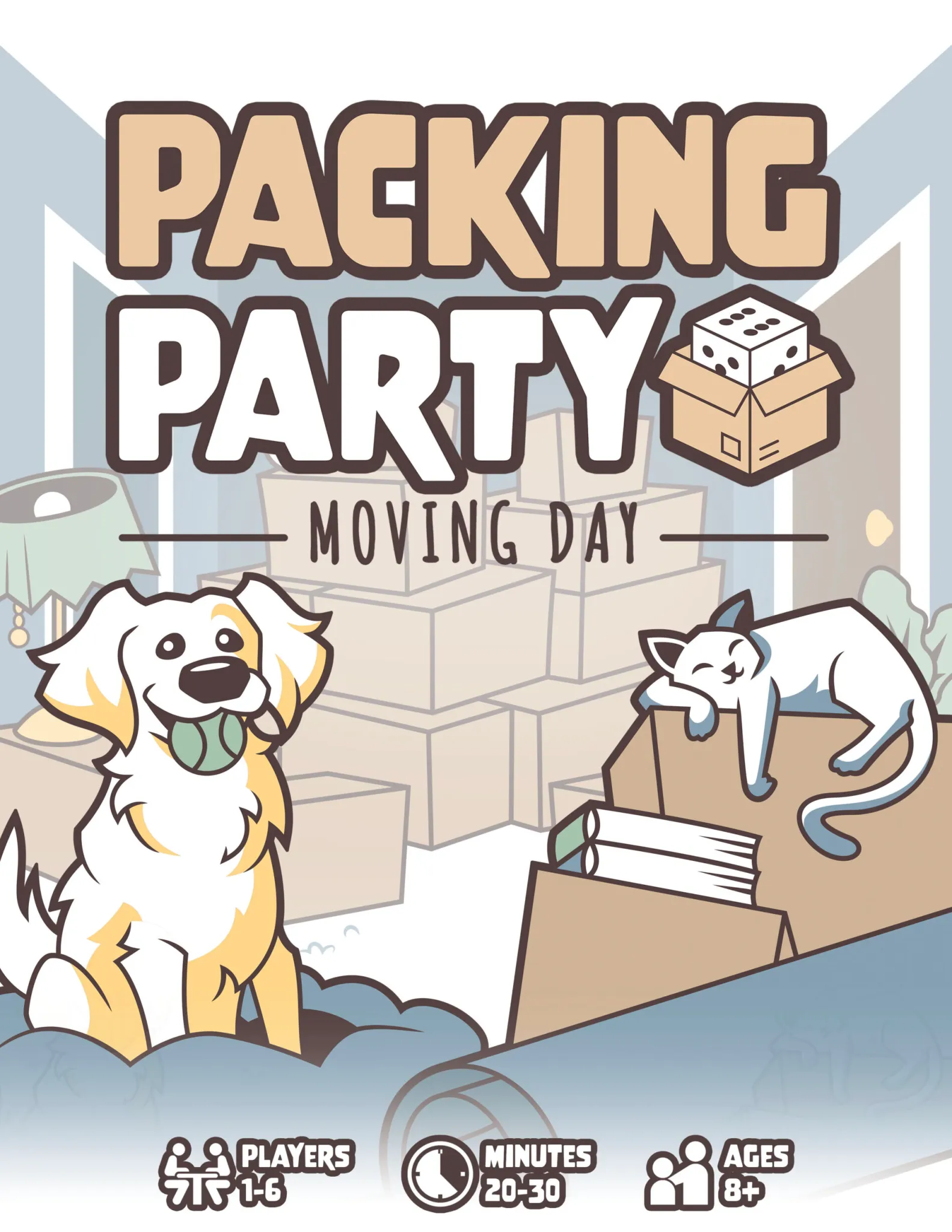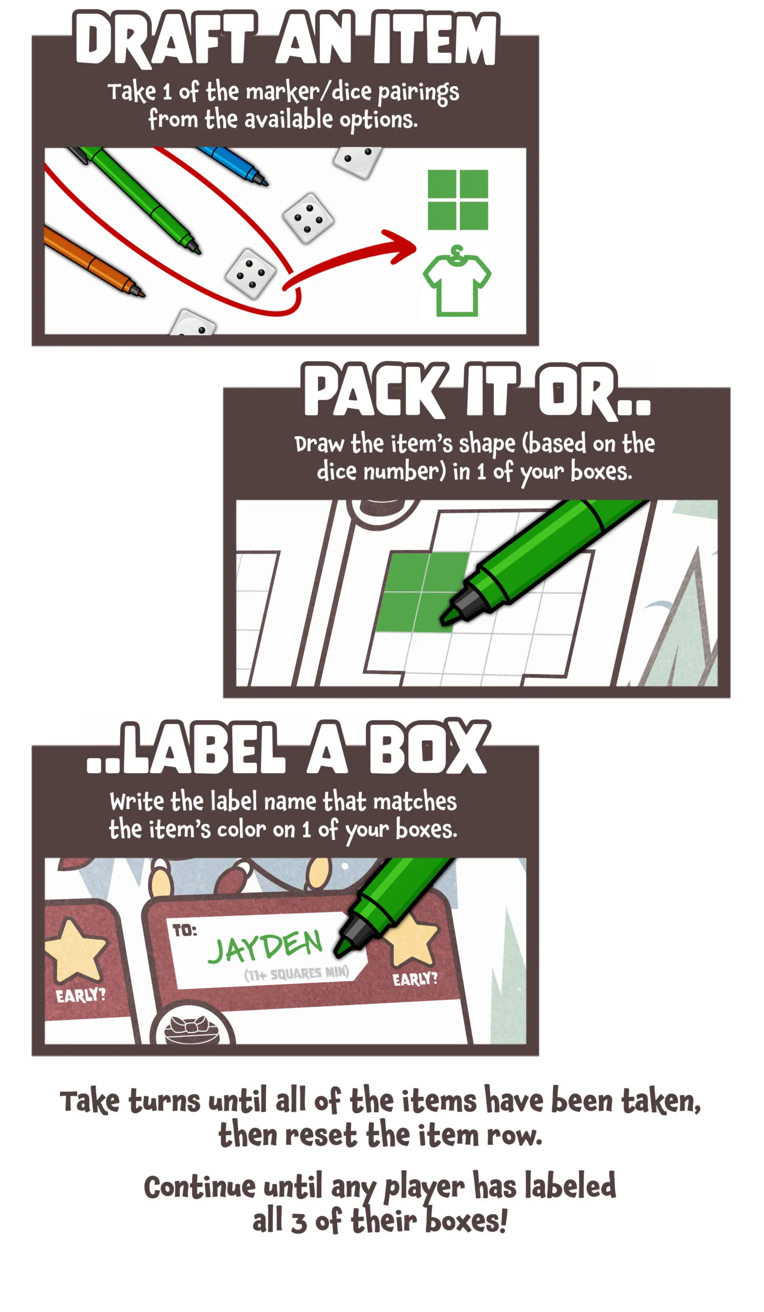 Finish packing the last few boxes and get them loaded in the truck – it’s moving day! Sort through a pile of household items (marker/die pairings) which you’ll be drafting and packing into your 3 cardboard boxes. Each item’s dice number sets its shape, and its marker color tells you what type of item it is. Organize your boxes with a variety of items and score bonuses for labeling them with the right rooms to make unpacking a breeze!