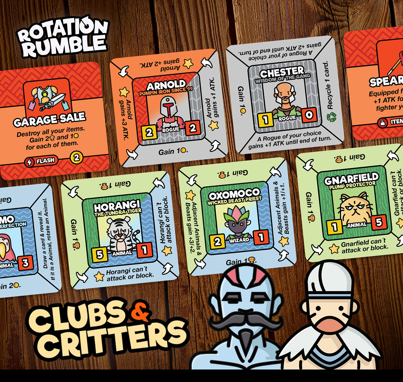 Rotation Rumble is a micro card game featuring square cards. Most cards have a different ability on each of their sides, which can be used or activated by rotating them, offering endless strategic combinations!