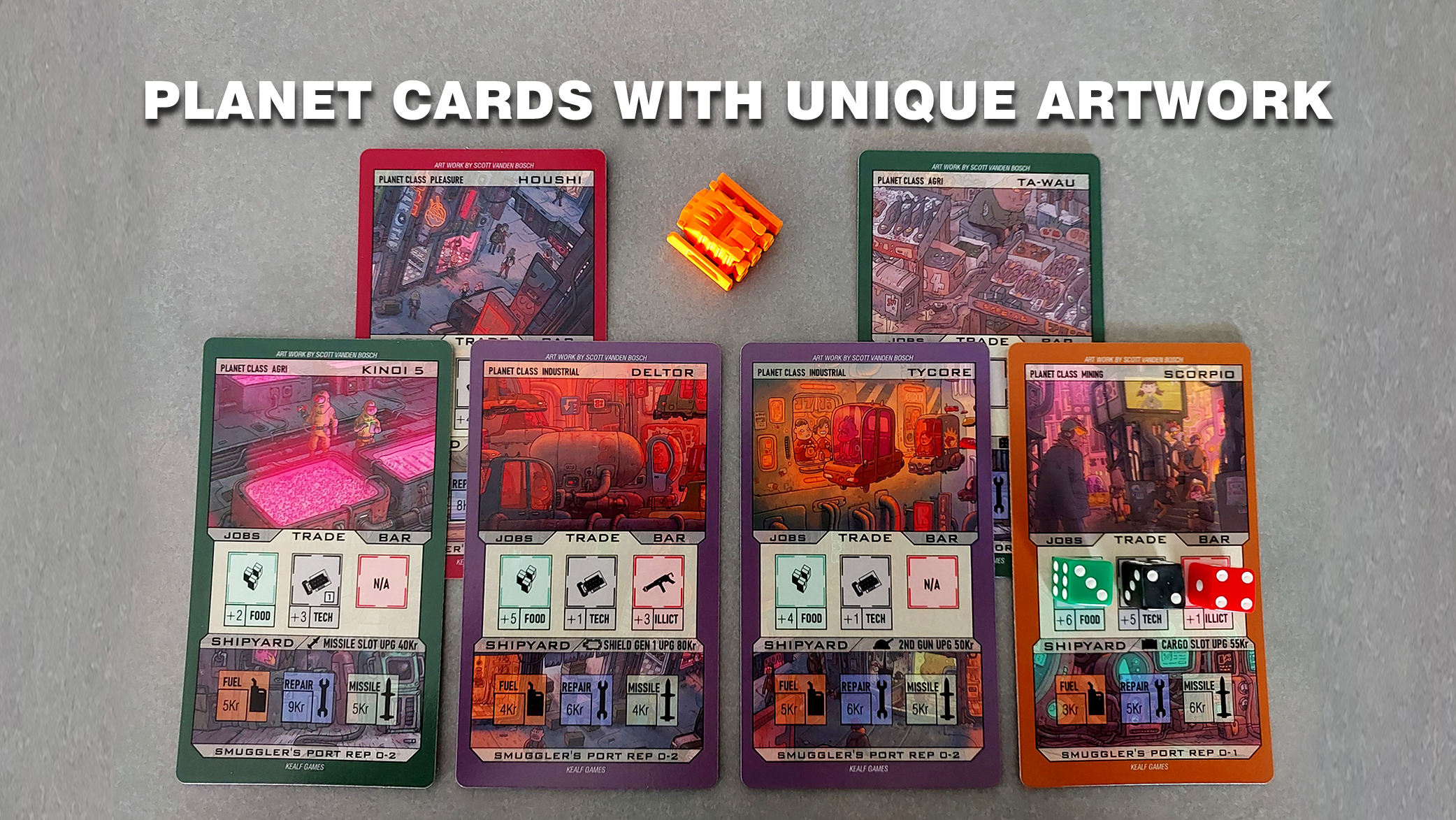 1)Players may travel from planet to planet to make some profit by trading commodities using a dice mechanic that will change the prices of commodities depending on the type of planet they visit.